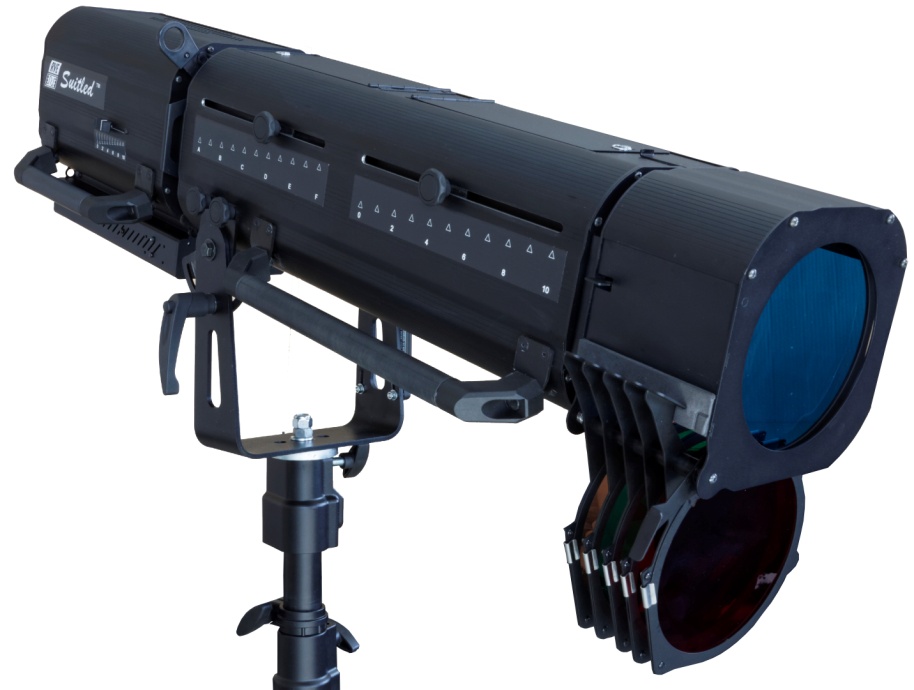 Hochleistungs Zoom-Optik, inkl. Farbwechsler mit 6 bestückten Farben, Irisblende (ganzschliessend), integrierter Dimmer und externe Ansteuermöglichkeit über DMX, inkl. Stativ mit Gewichtsausgleich Scharfzeichnende Blendenschieber oder Projektionsgobohalter möglich (optional); Anschlusskabel 2,5m, Stecker T13